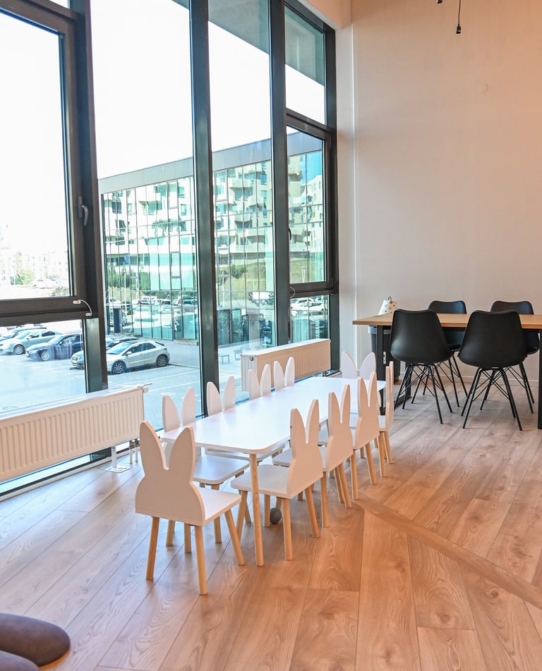Studijoje įrengti du atskiri stalai – erdvus stalas tėvams, prie kurio patogu prisėsti su kava ar vaišėmis, ir vaikiškas staliukas, pritaikytas mažųjų užkandžiams, piešimui ar žaidimams.